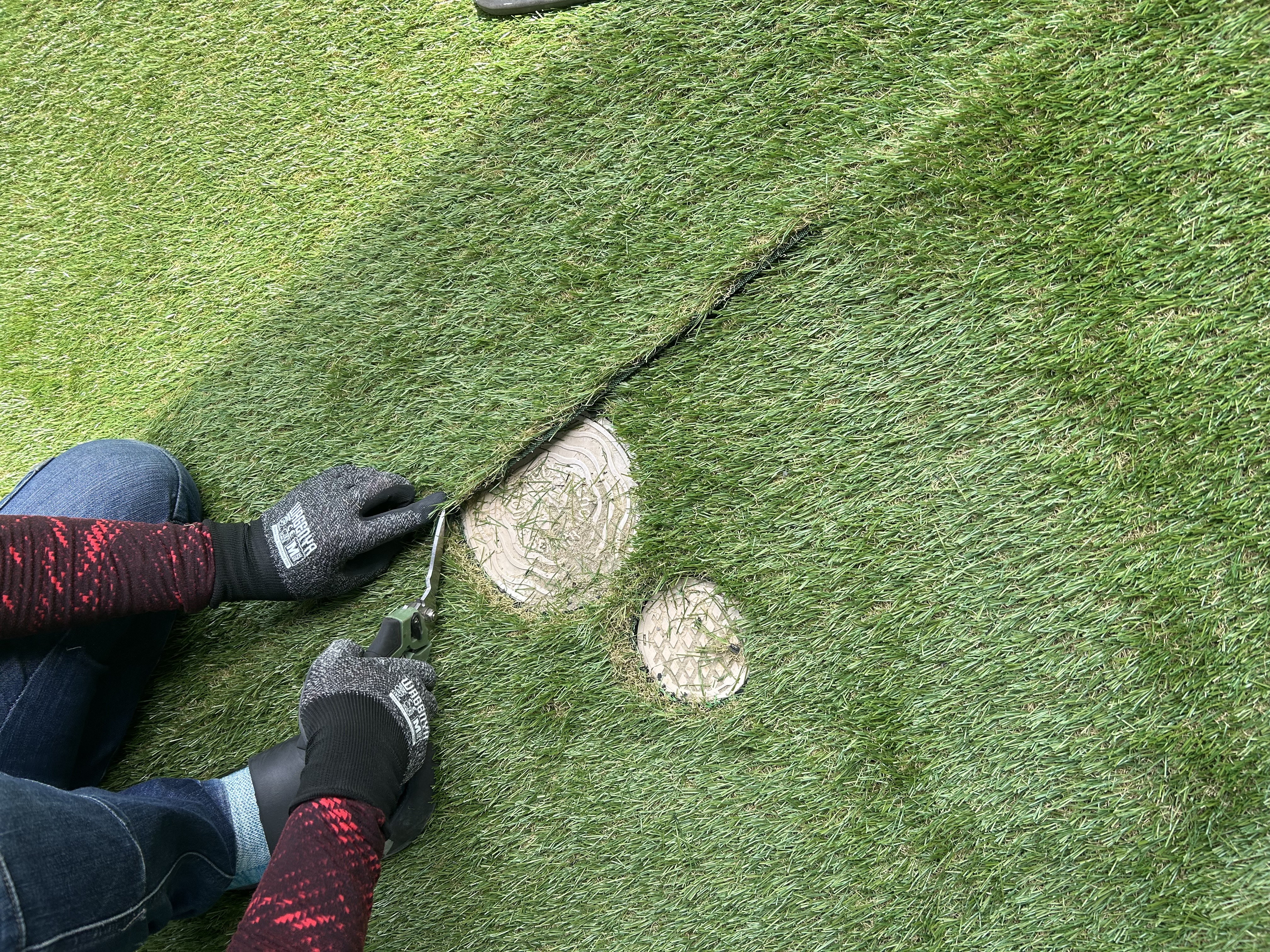 人工芝を被せては行けない舛等がある部分は↑こういった風に切り取って行きます。