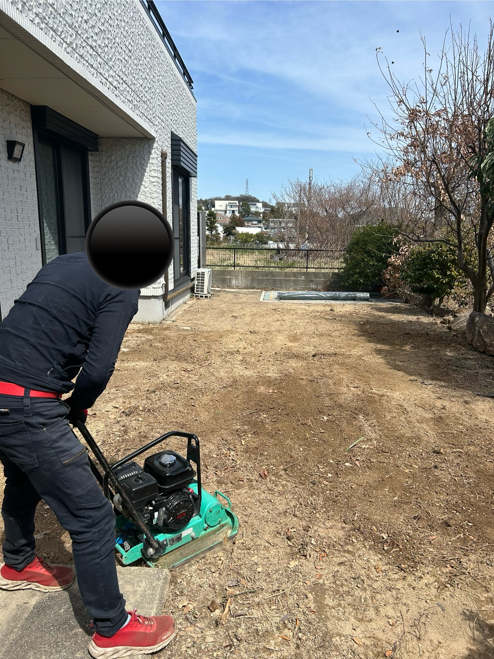まずここから元々敷いてある人工芝を全て撤去した後草刈り→整地→転圧作業→除草剤散布を行いました。